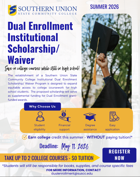 We are excited to announce that Summer 2026 Dual Enrollment registration opened on April 13, 2026! Through Southern Union’s Dual Enrollment Institutional Scholarship/Waiver, eligible students can take up to two (2) college courses with $0 tuition this summer.