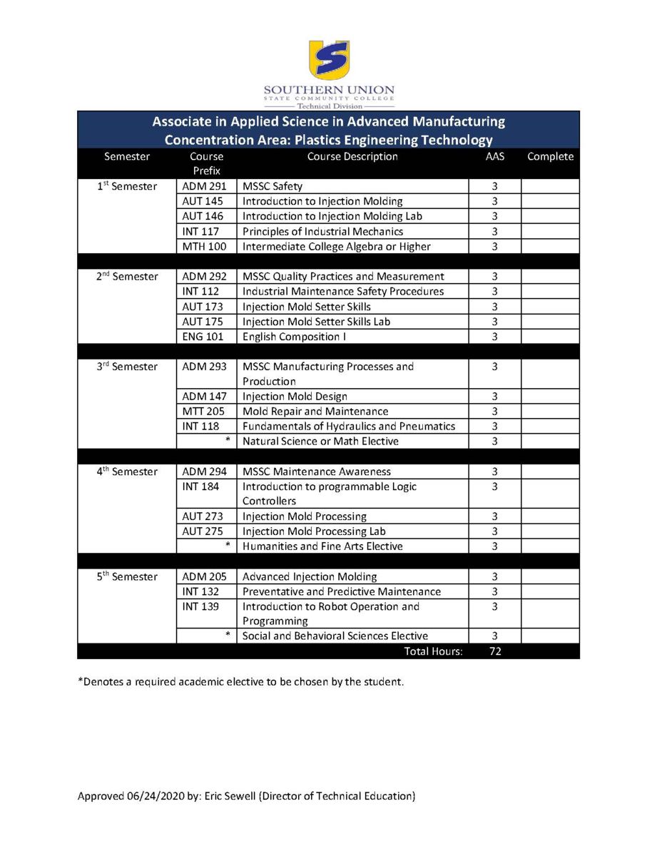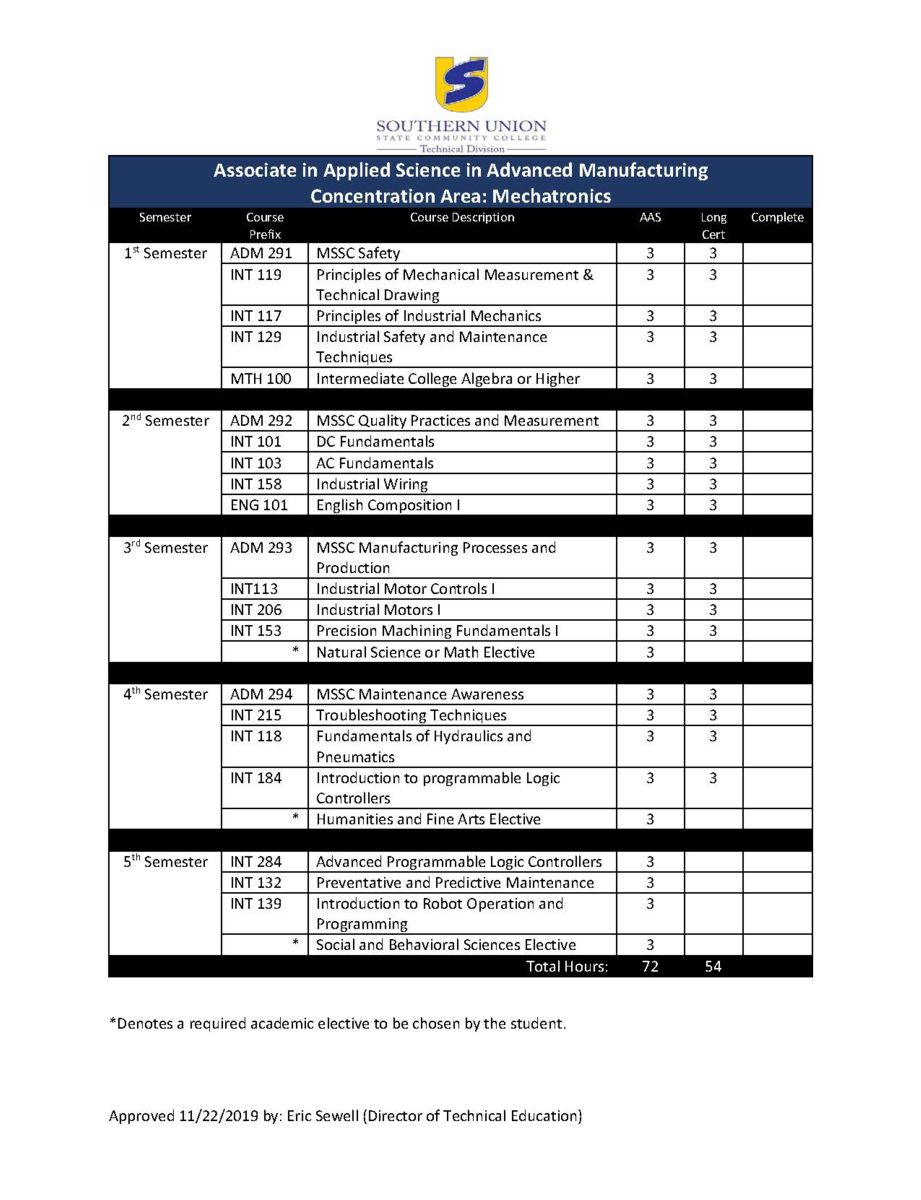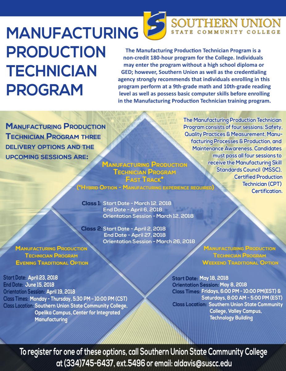 The Manufacturing Production Technician Program is a non-credit 180-hour program for the College. Individuals may enter the program without a high school diploma or GED; however, Southern Union as well as the credentialing agency strongly recommends that individuals enrolling in this program perform at a 9th-grade math and 10th-grade reading level as well as possess basic computer skills before enrolling in the Manufacturing Production Technician training program.