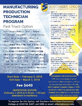 The Manufacturing Production Technician Program Weekend Traditional Option (Friday and Saturday) prepares individuals for front-line production work in high-performance manufacturing. Classes are held at the Southern Union State Community College, Valley Campus, Technology Building.